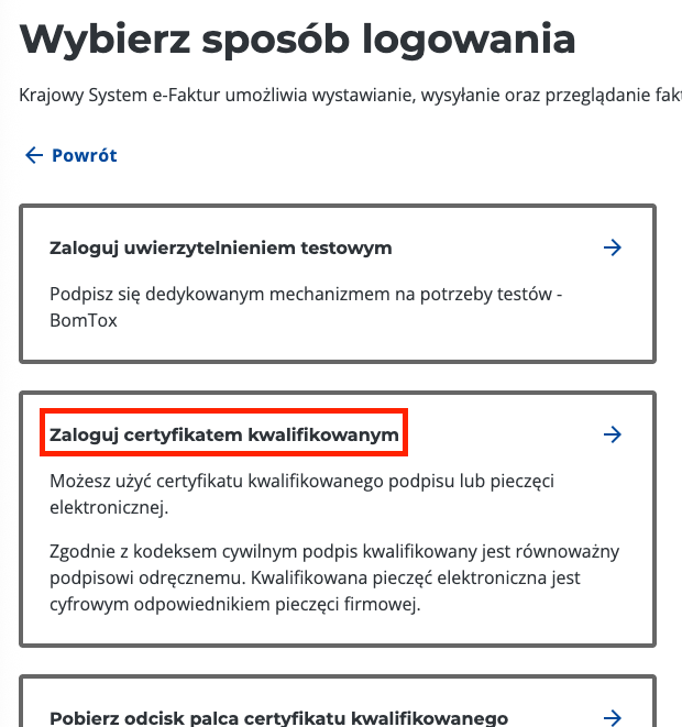 Wybierz opcję “Zaloguj się certyfikatem kwalifikowanym”