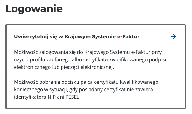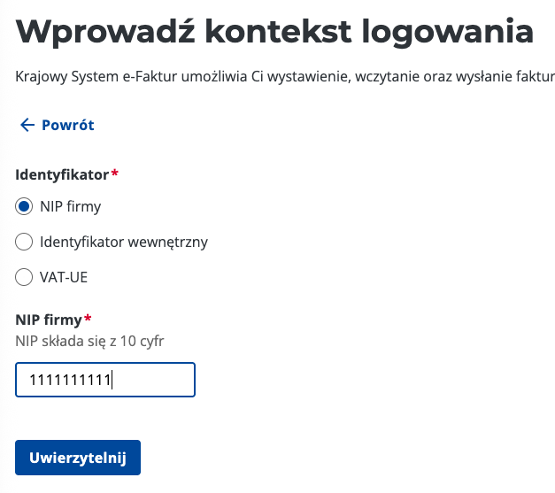Wybierz opcję “Uwierzytelnij się w Krajowym systemie e-Faktur”