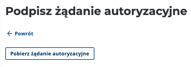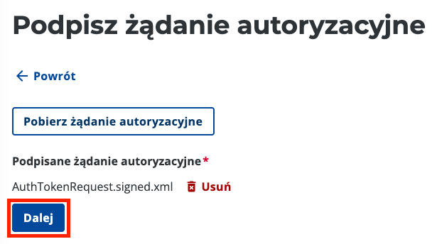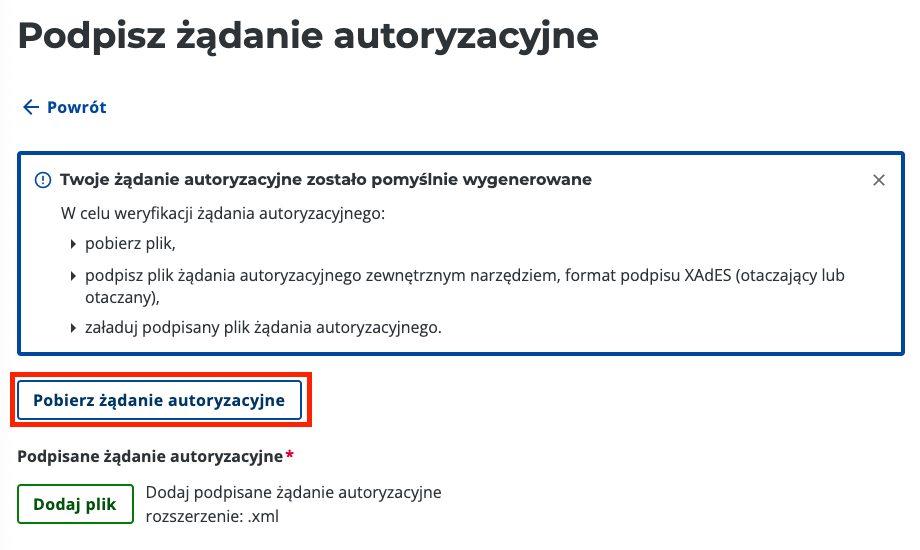 Kliknij przycisk “Pobierz żądanie autoryzacyjne” i zapisz plik XML wygenerowany przez system KSeF. Jest to plik wyzwania