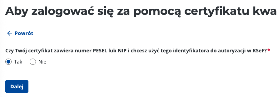 Na pytanie “Czy Twój certyfikat zawiera numer PESEL lub ( … ) wybierz odpowiedź “Tak”